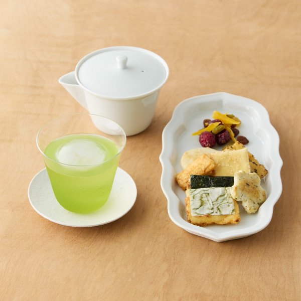 抹茶入り玄米茶(冷茶)×あられの花道 ドライフルーツ添え